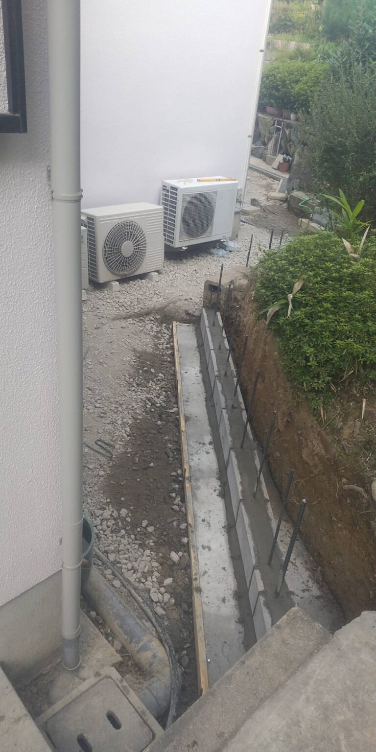 前回は現状の様子と透水管の施工、擁壁ブロックの掘削作業までを