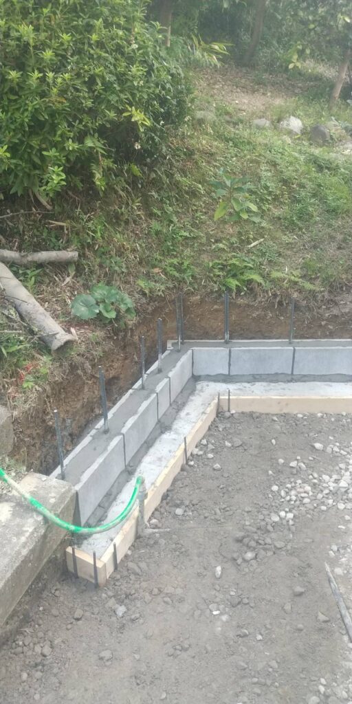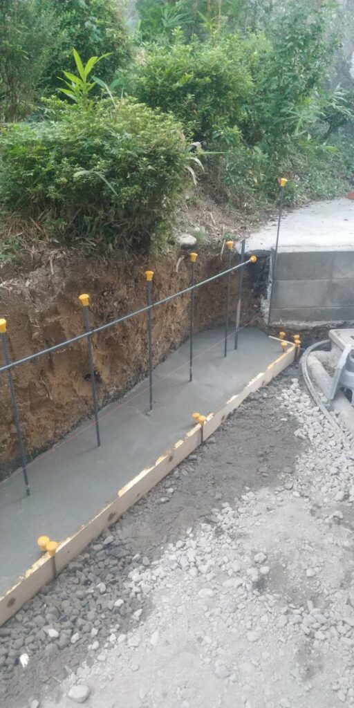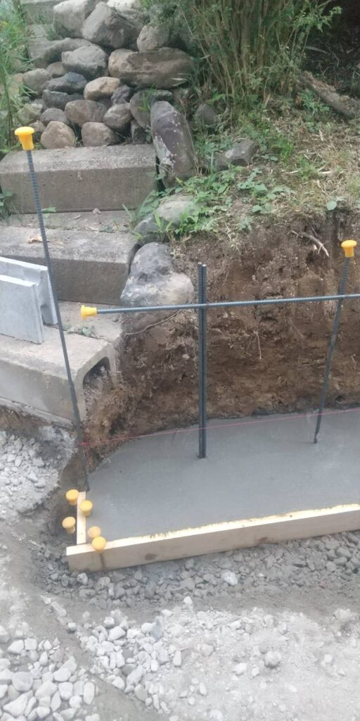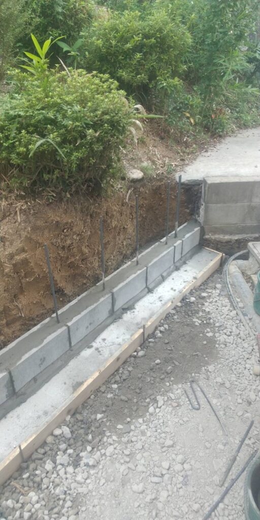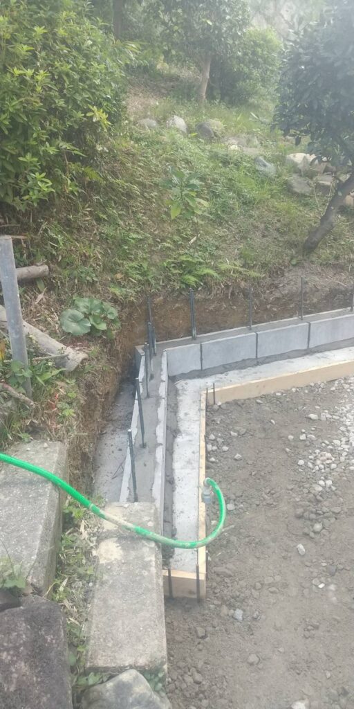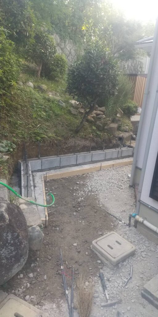 今回は擁壁の土台づくりと1段目の積み上げがメインの工程でした。