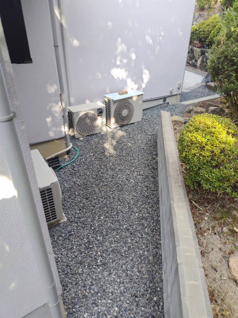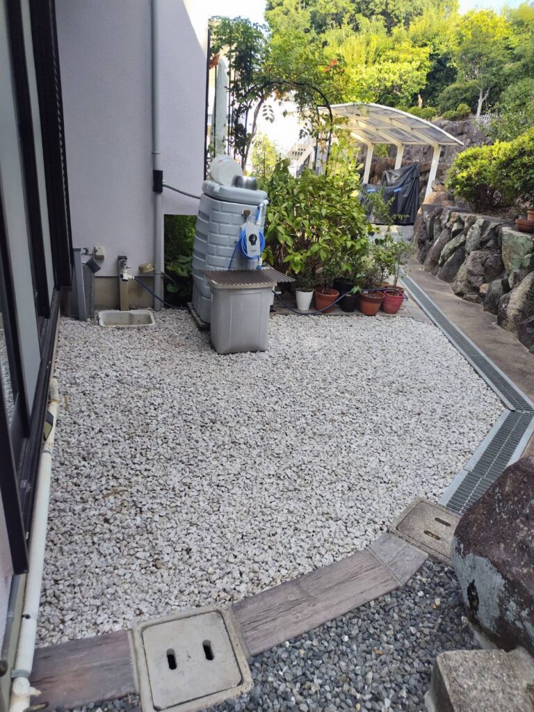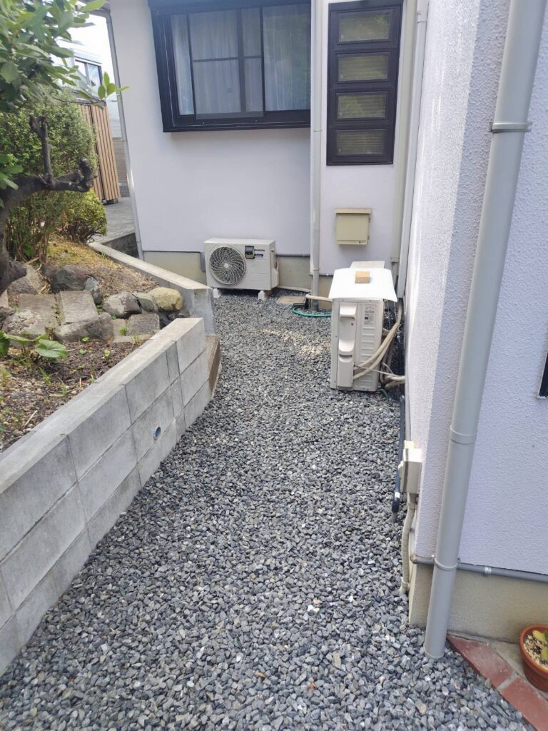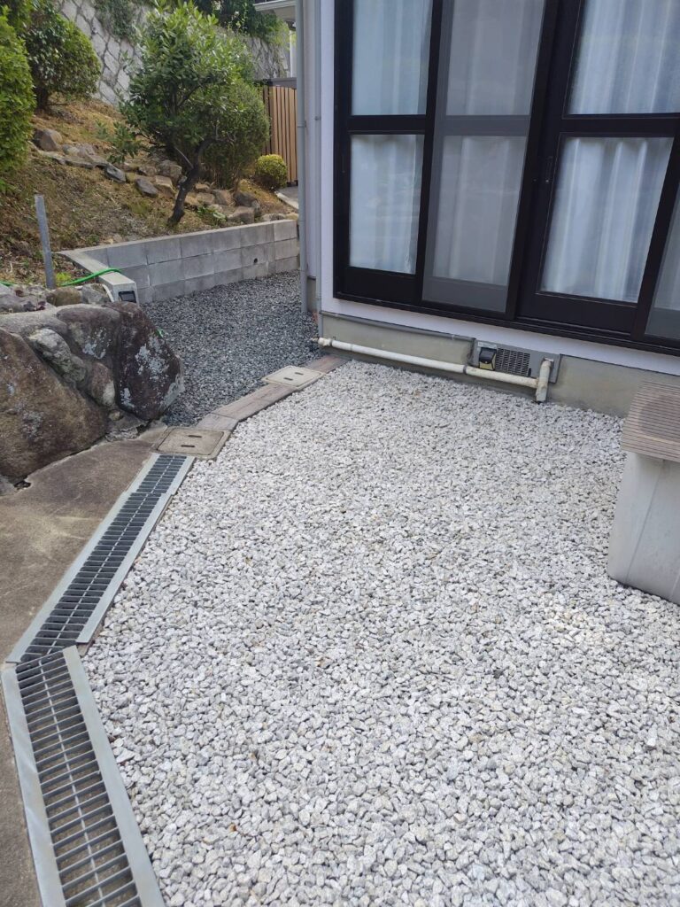 施工後は、お庭全体がすっきり明るい印象に変わり、歩きやすさ・お手入れのしやすさも改善されました。砂利敷きには水はね防止の効果もあるため、外壁が汚れにくくなるメリットもあります。