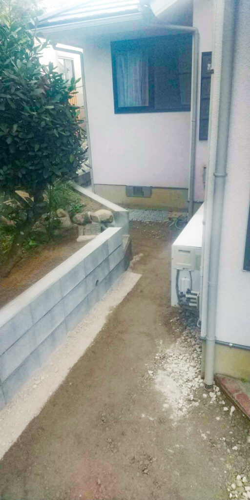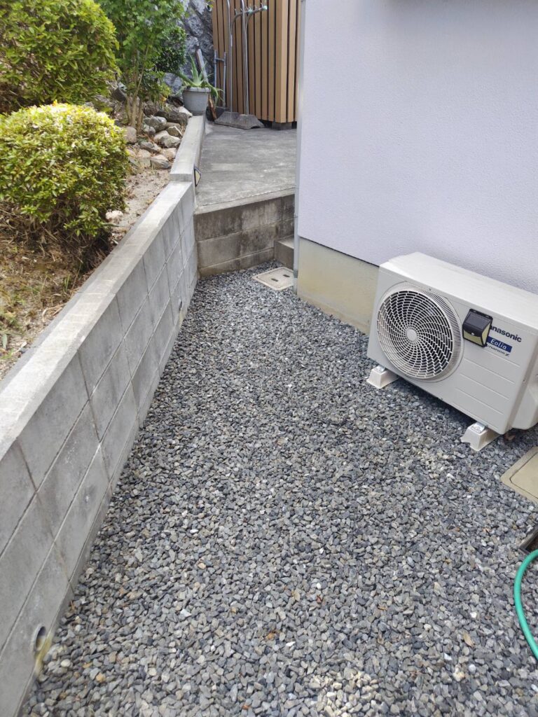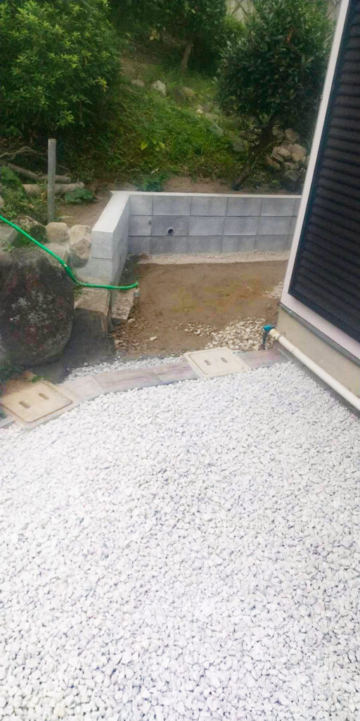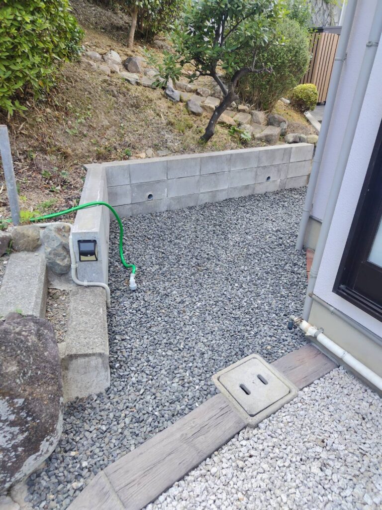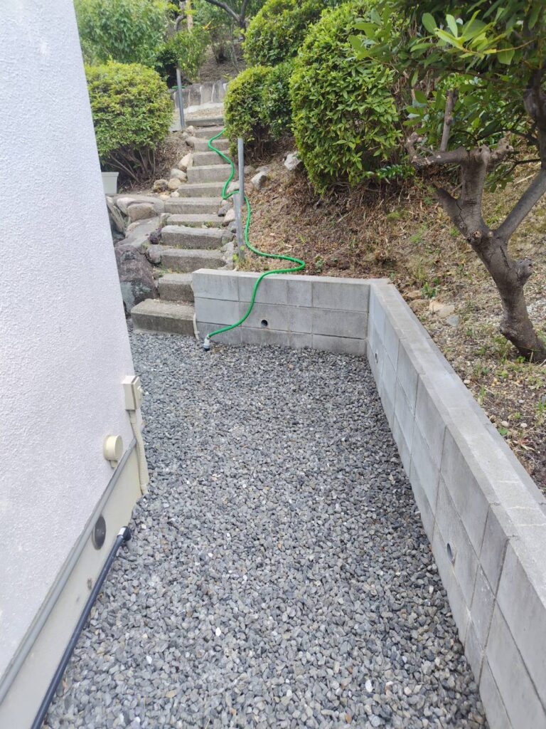 施工後は、お庭全体がすっきり明るい印象に変わり、歩きやすさ・お手入れのしやすさも改善されました。砂利敷きには水はね防止の効果もあるため、外壁が汚れにくくなるメリットもあります。