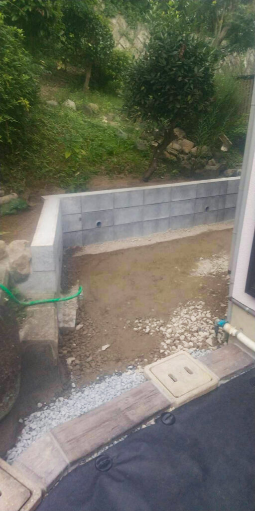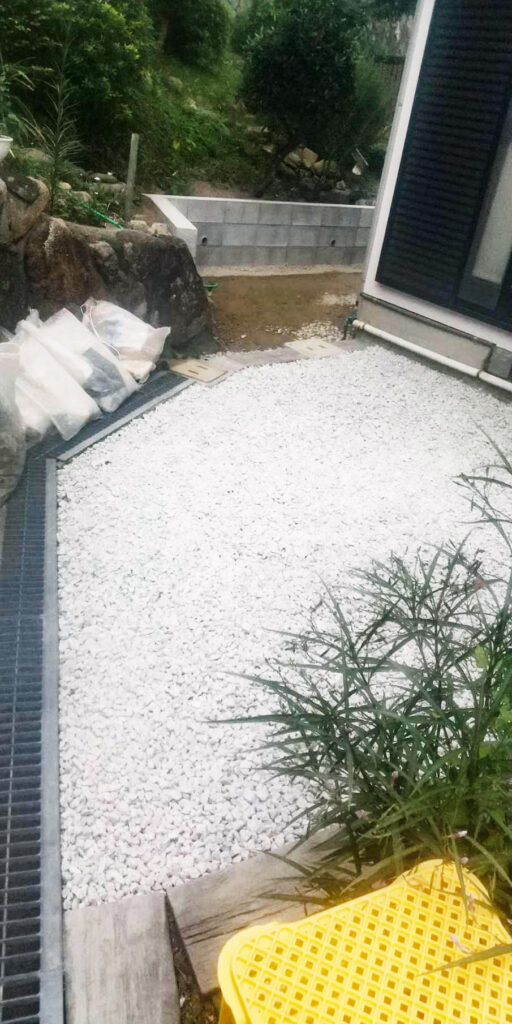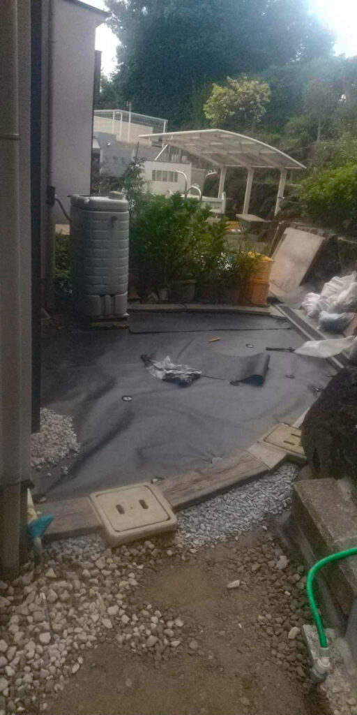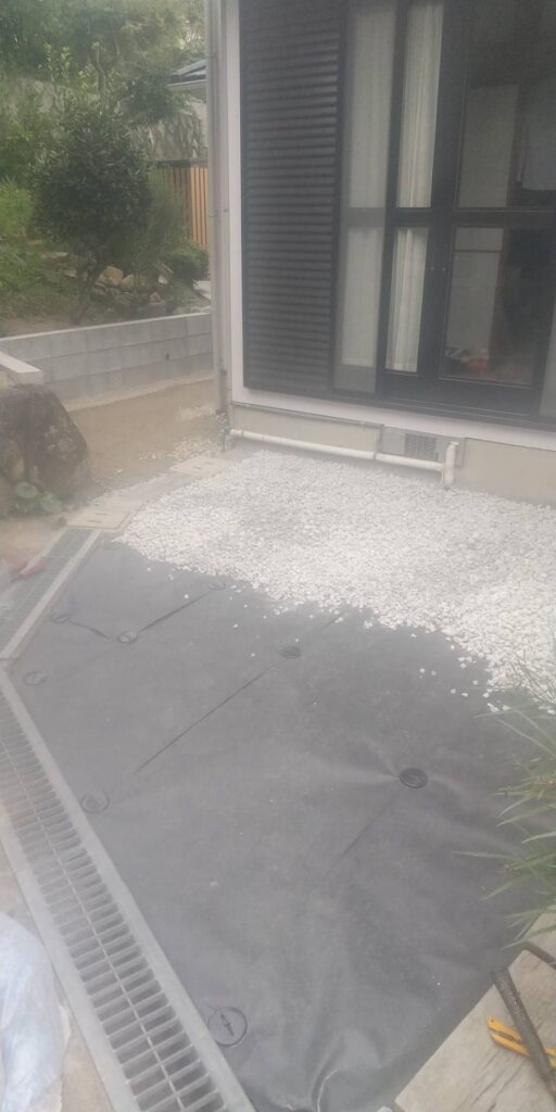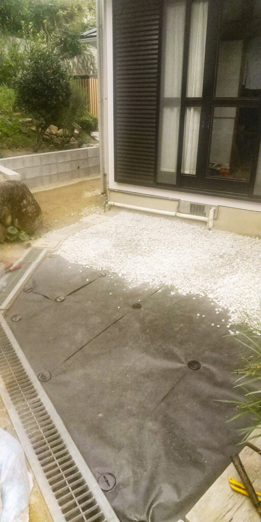 今回は、最後の仕上げの部分、防草シートの敷設と砂利敷きをご紹介します。