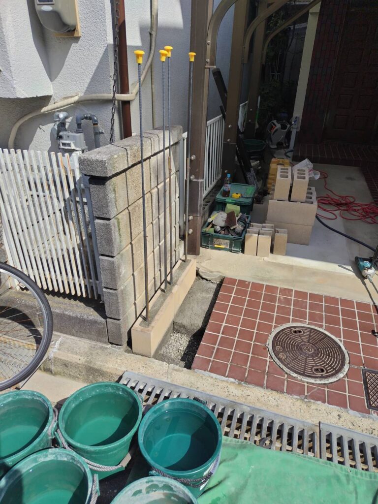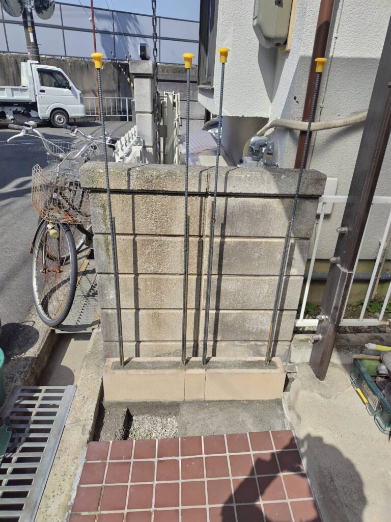 今回も、鉄筋を立ててからブロックを積み上げ、塀としての強さを確保できるよう施工しています。
