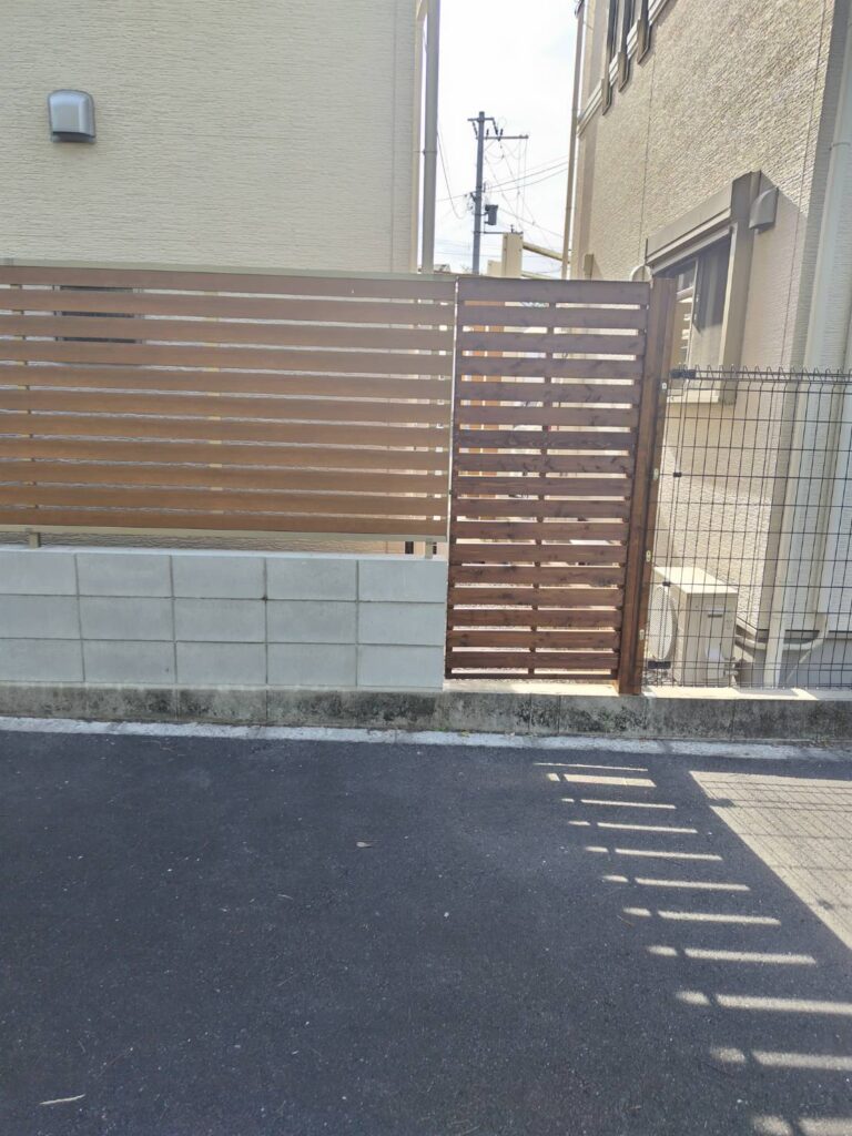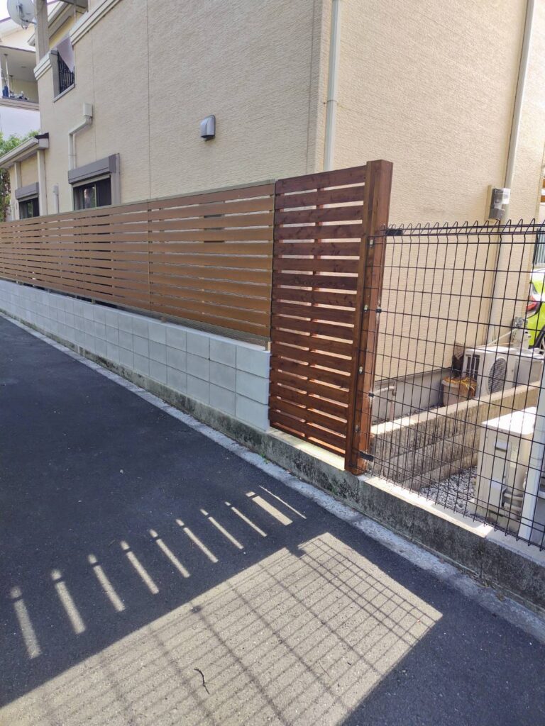今回はまずブロックを新設し、その上に木目調の横格子フェンスを取り付けました。