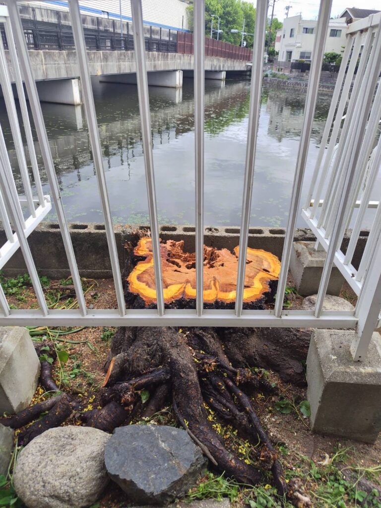 今回は、池に大きくせり出した桜の伐採作業をご紹介します。